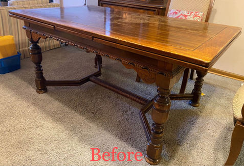 1920's Jacobean style solid mahogany dining room furniture: a draw-leaf table and antique pressed back chairs, as well as a pair of buffet's. Refinished in Wise Owl OHE "jet Black".